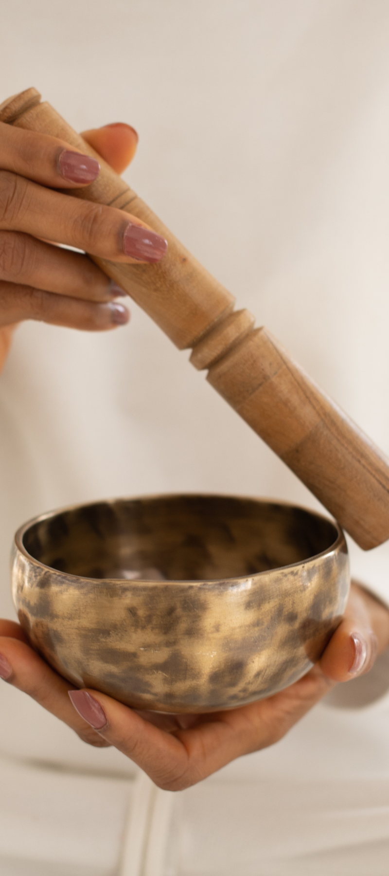 On utilise généralement un maillet en bois pour frapper le bord extérieur du bol ou pour frotter le bord avec un mouvement circulaire. Les deux méthodes produisent des sons distincts : une résonance continue ou un son de cloche.