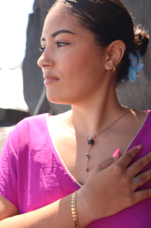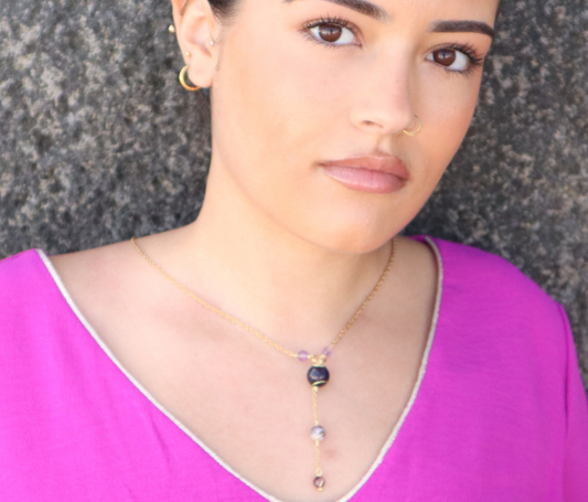 Éveillez votre lumière intérieure avec la nouvelle collection de bijoux en acier inoxydable doré et améthyste.