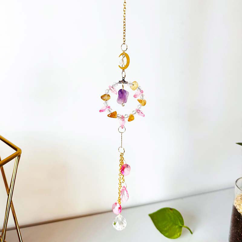 Découvrez le pouvoir apaisant de cette attrape soleil en quartz rose naturel pour décoration intérieur ou extérieur plaqué métal. Les breloques en verre en forme de larme et le lien en lune ajoutent une touche de sérénité. longueur de 410 mm.