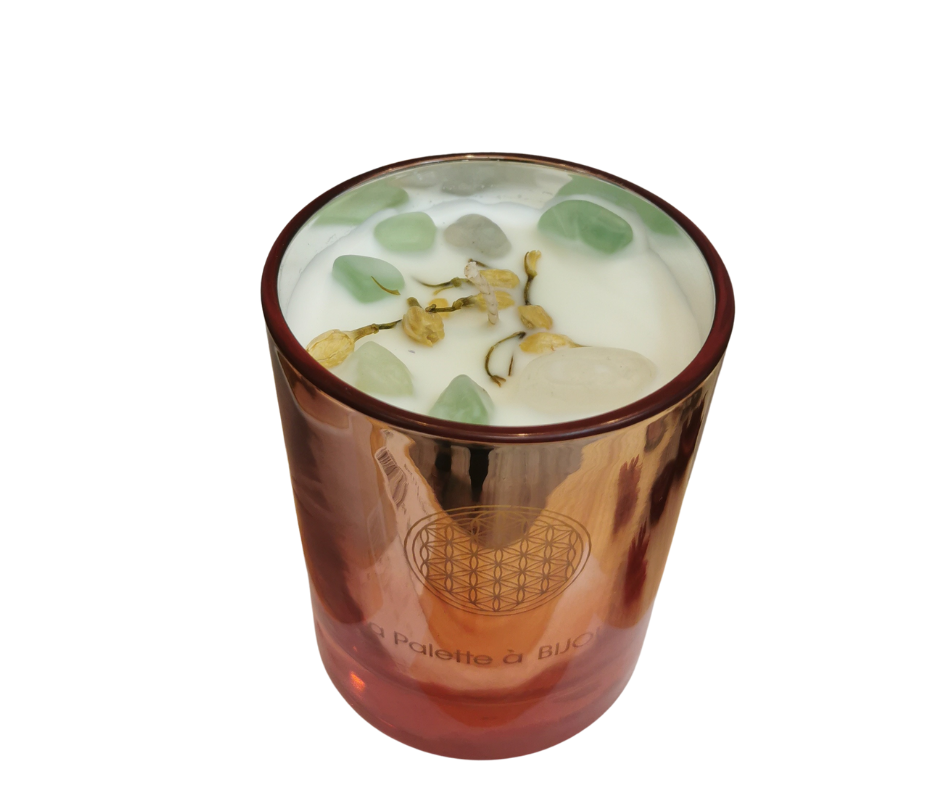 Bougie, senteur champagne odeur fine et très agréable pour les moments de détente. La fluorite favorise l'introspection, la clarté d'esprit convient très bien dans les rituels où il faut prendre une décision. Les cristaux qui se libère au fur et a mesure que le bougie est utilisé pourront être utilisé par la suite en pierre de poche. Son magnifique contenant rosé laisse transparaitre une lumière chaude avec sa fleur de vie en filigrane. Le contenant peu en suite survira à de multiples usages. Livré dans une belle boite de présentation idéal à offrir ou à s'offrir