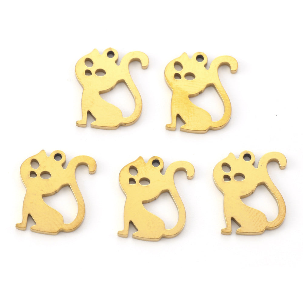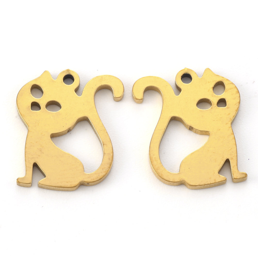 En acier inoxydable 304 plaquées sous vide PVD, Coupe au laser, forme de chat, véritable 18k plaqué or, 14.5x12.5x1mm, Trou: 1.2mm
