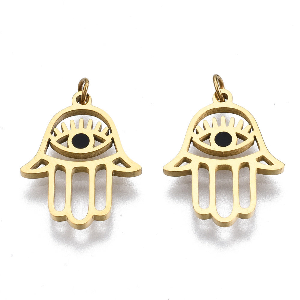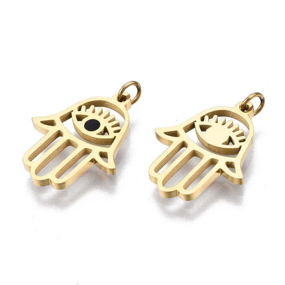 En émail en acier inoxydable 304, avec anneaux de jonction, hamsa main / main de fatima / main de miriam avec oeil, véritable 14k...