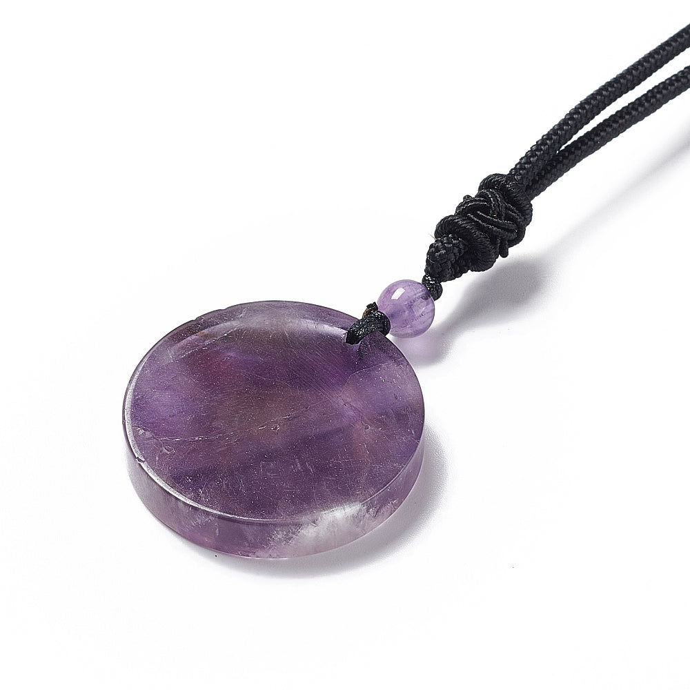 Collier pendentif améthyste naturelle ronde plate avec fleur de vie avec cordon en nylon pour femme,