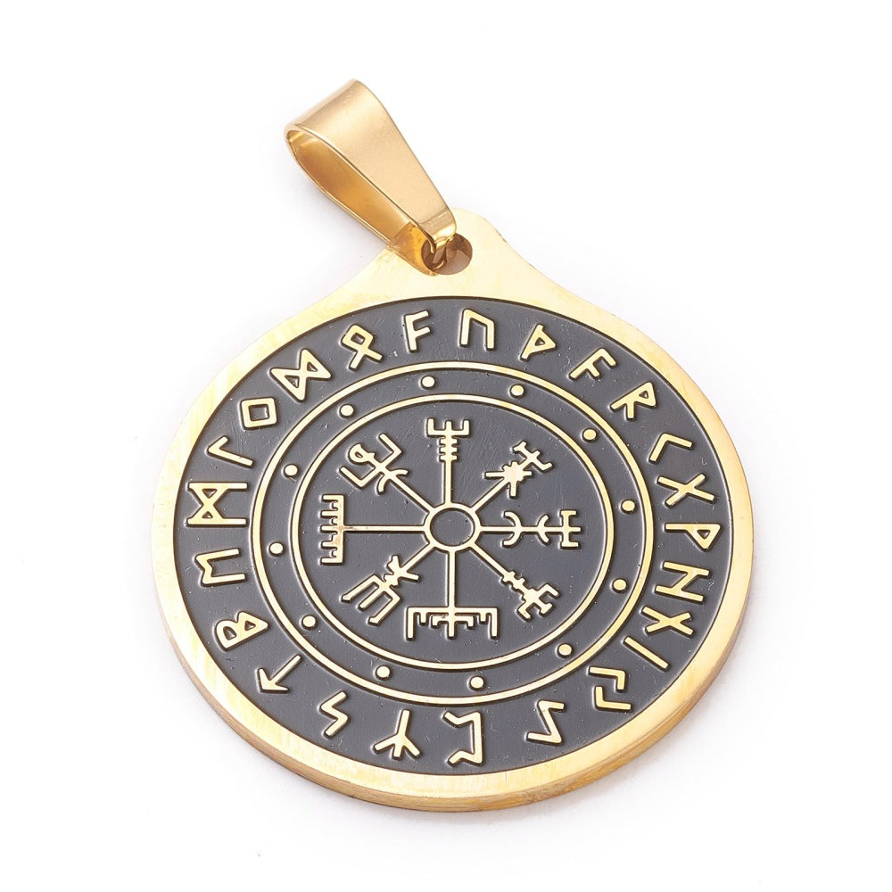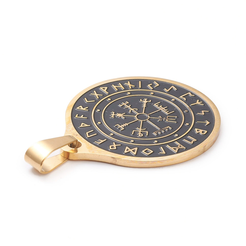 304 pendentifs en émail en acier inoxydable, boussole viking avec runes / futhark / futhorc,noir,or