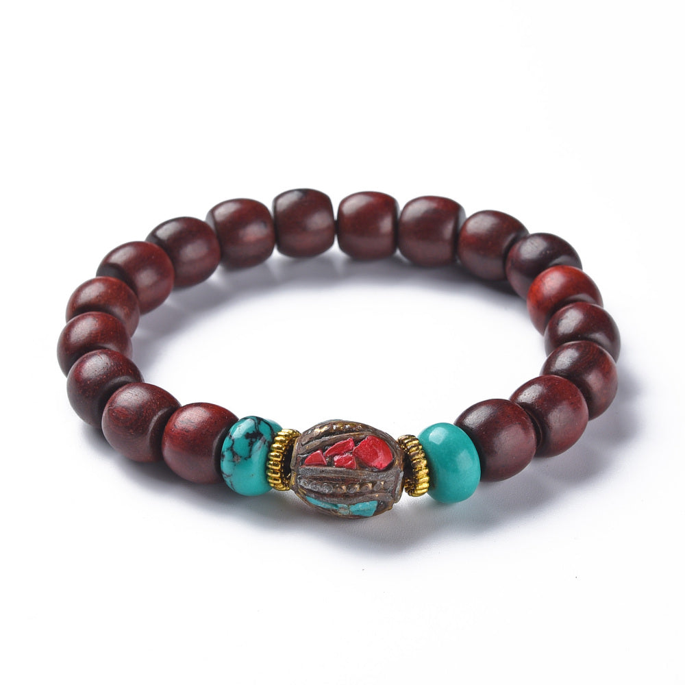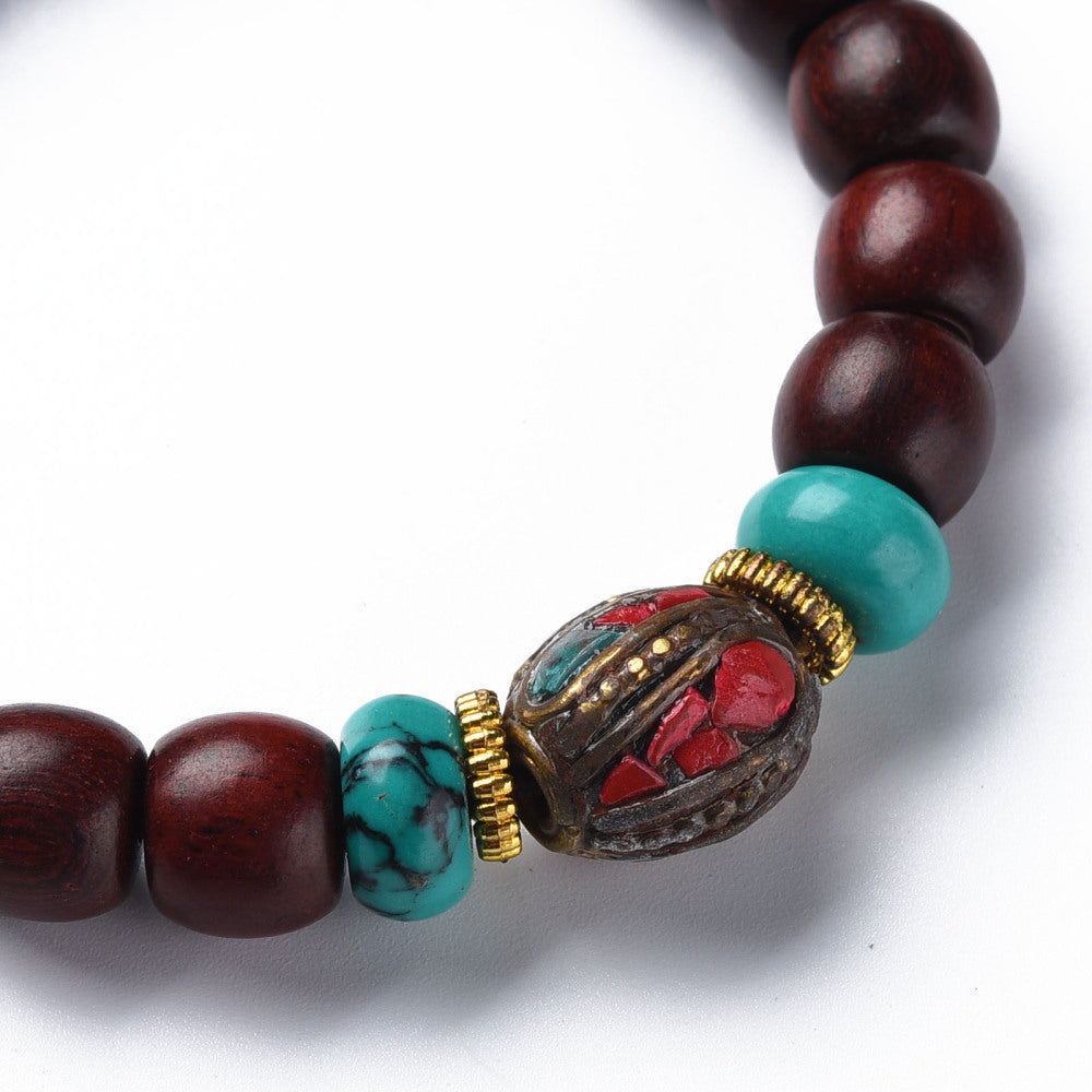 Bracelets de perles de mala en bois de santal rondelle, avec des perles synthétiques turquoises et indonésiennes, bijoux bouddhiste, Bracelets élastiques,brun coco