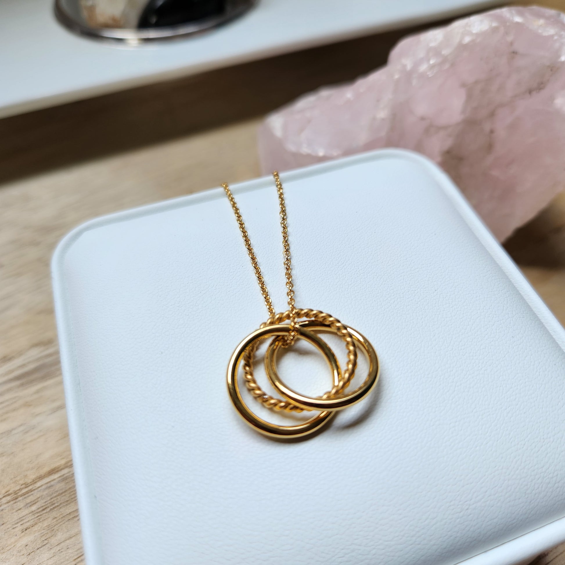 Collier en acier inoxydable avec 3 anneaux entremêlé gravé de 2 mantra (prière bouddhiste).
