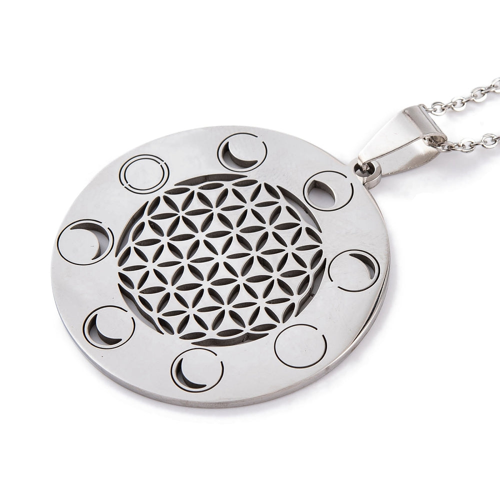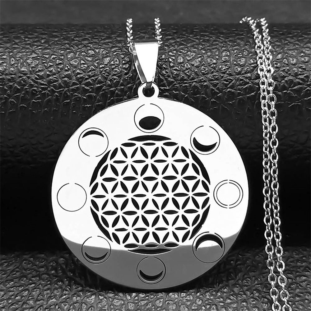 Ce collier fleur de vie et phase de la lune en acier inoxydable est à la fois élégant et symbolique. Le pendentif rond plat représente la fleur de vie, symbole de l'énergie vitale et de l'harmonie, tandis que la phase de la lune représente le cycle de la vie. Mesurant environ 19.76 pouces (50.2 cm) de long, ce collier est un accessoire intemporel pour toutes occasions.