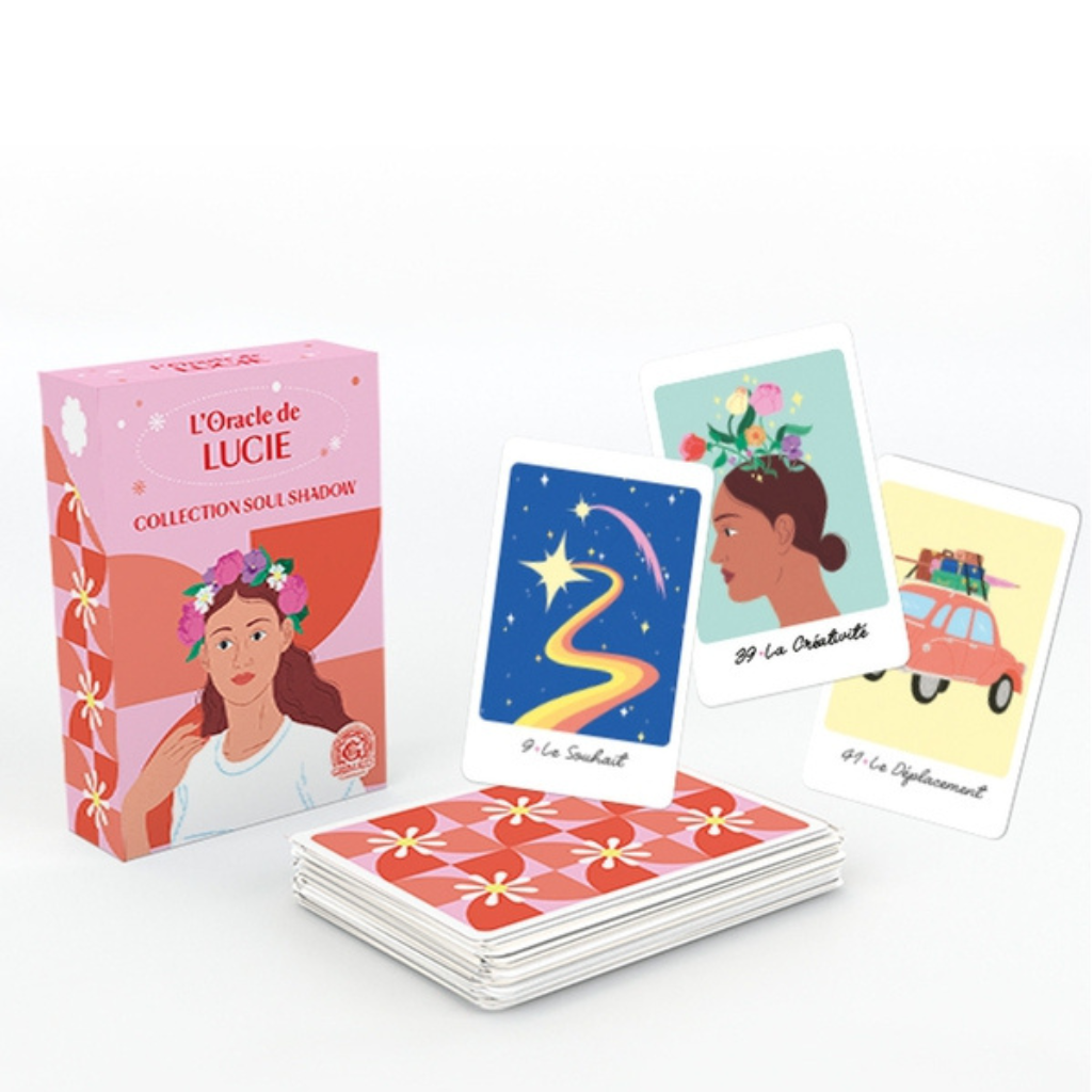 « Coucou, je suis Lucie, on vient souvent me consulter pour apporter des réponses à tous types de questions. Mes amis disent que je suis douce, attentionnée, avec un talent pour transmettre de sages conseils grâce à mes cartes oracle ». Lucie et son oracle classique divinatoire permettent d’interroger le passé, le présent et l’avenir avec clarté et justesse pour guider sur la voie du futur désirée. Cet oracle peut s’utiliser dans les lectures divinatoires ou coachings personnels.Jeu de 55 cartes au format poker et packaging compact, pratique à emporter partout avec soi pour des tirages nomades ou lors de rendez-vous entre amis. Des vidéos de découverte et d’utilisation de l’oracle via un QR code ainsi que des fiches de synthèse sur la signification des cartes permettent une prise en main immédiate. Hyena, cartomancienne de la chaine YouTube Soul Shadow, a conçu une collection d’outils divinatoires accessibles à tous : spécial débutants et experts. Cette collection a été pensée comme une bande d’amis , chaque jeu dispose d’un prénom, d’un système divinatoire qui lui est propre et d’un type de conseils comme le ferait un ami selon sa personnalité. Ces oracles disposent de la même tonalité de couleurs afin de pouvoir être mixés ensemble et d’enrichir les tirages tout en gardant une cohérence graphique.