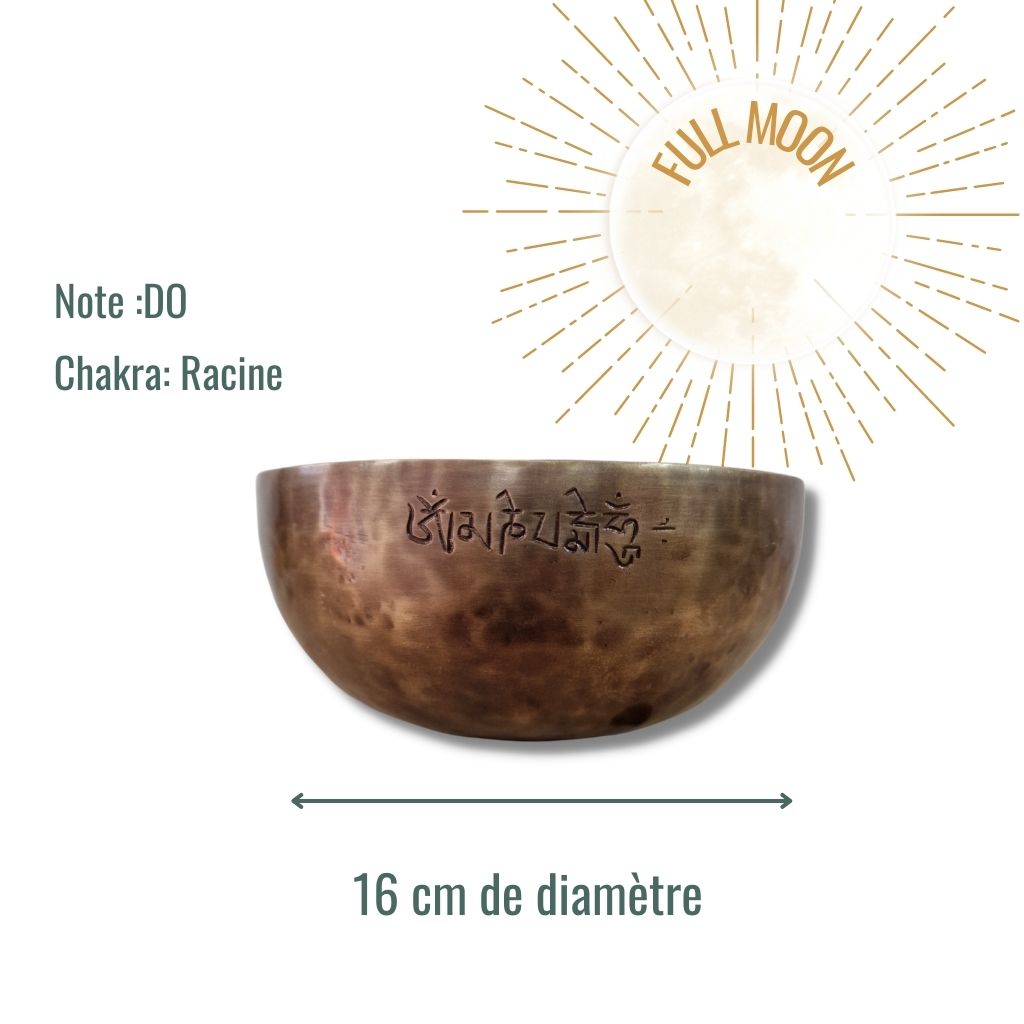 Les bols Full Moon sont les bols en métal de la plus haute qualité reconnue a ce jour, c'est un bol en métal martelé à la mains les soir de pleine lune. Il est donc très rare et doté d'une énergie particulière. Leurs sons en est plus profond et la texture de la note est plus pure et raisonne plus longtemps qu'un bol tibétain classique. Par l'union des énergies de la terre et de la lune ce bol procure une sensation de communion, de bien-être par ce chant de pure qui en fait un moment de connexion avec l'univers, un moment d'extase émotionnel inexplicable.
