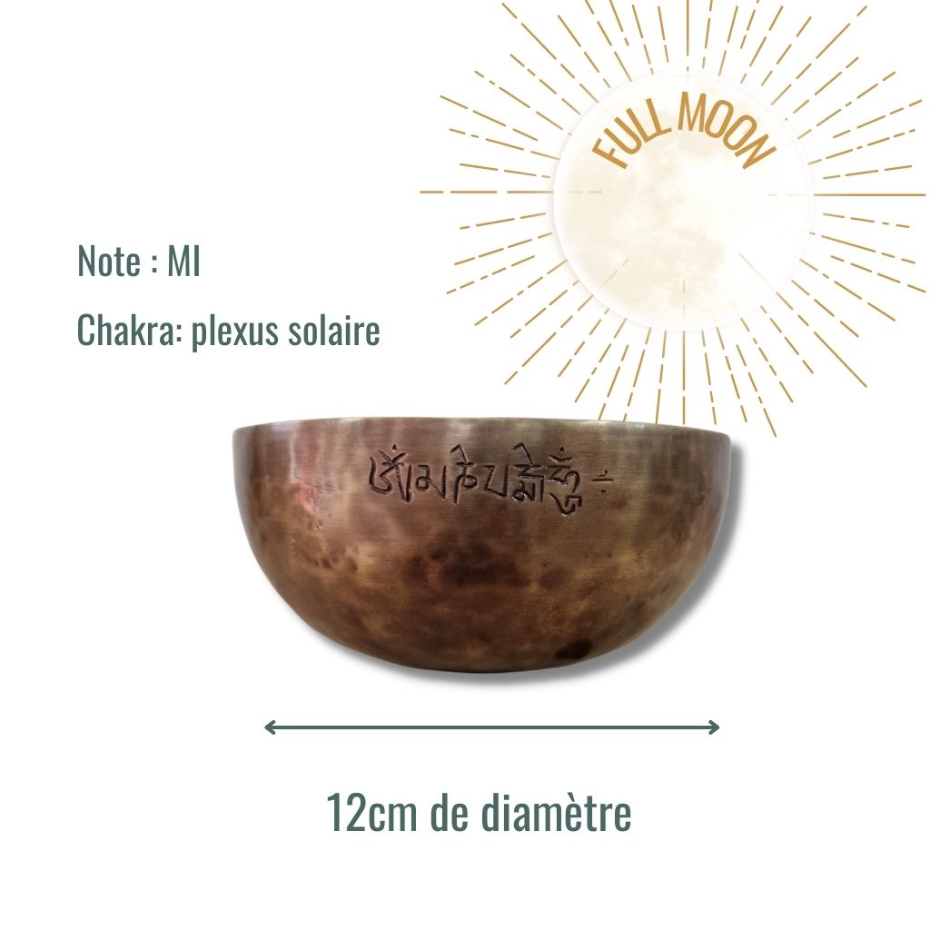 Les bols Full Moon sont les bols en métal de la plus haute qualité reconnue a ce jour, c'est un bol en métal martelé à la mains les soir de pleine lune. Il est donc très rare et doté d'une énergie particulière. Leurs sons en est plus profond et la texture de la note est plus pure et raisonne plus longtemps qu'un bol tibétain classique. Par l'union des énergies de la terre et de la lune ce bol procure une sensation de communion, de bien-être par ce chant de pure qui en fait un moment de connexion avec l'univers, un moment d'extase émotionnel inexplicable.