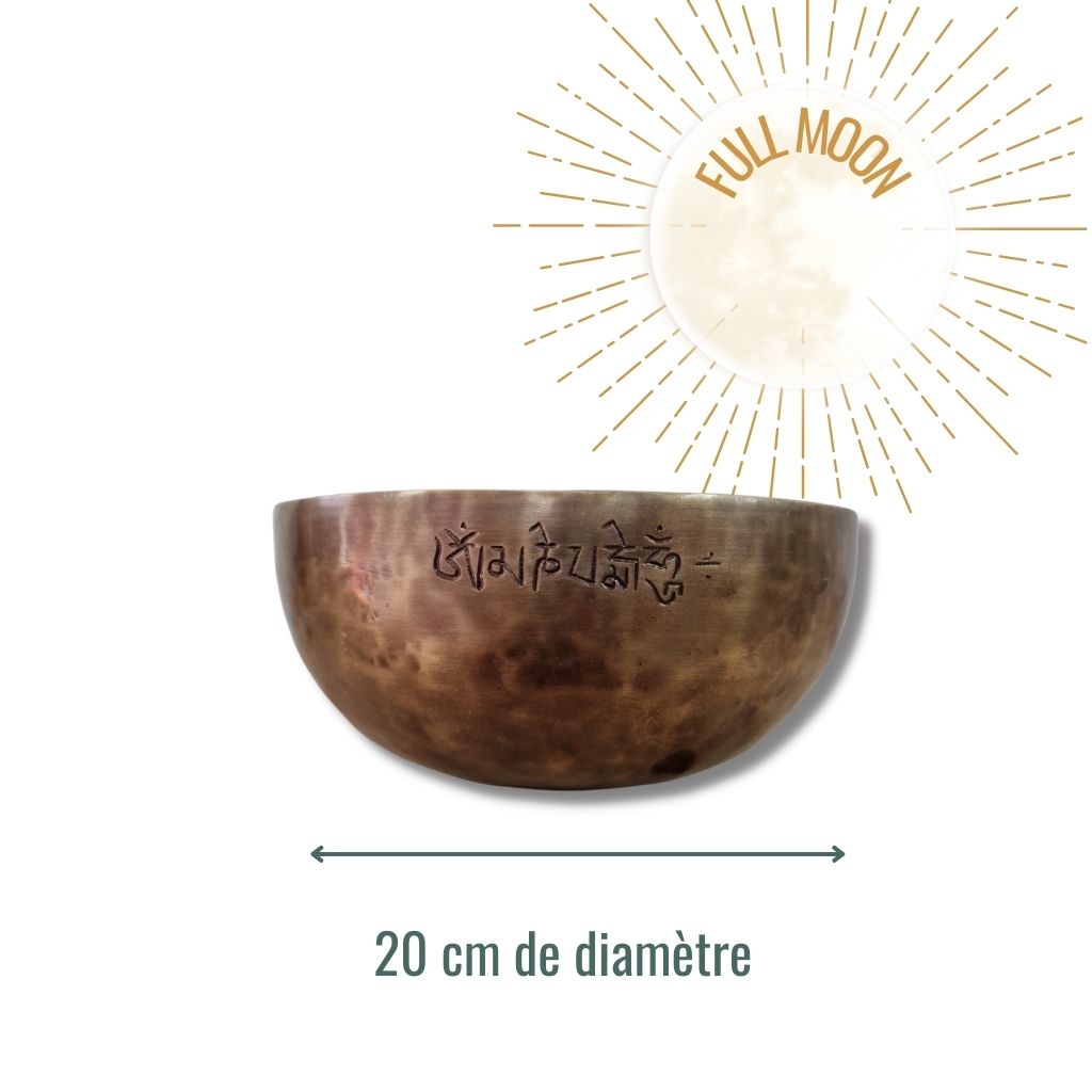 Les bols Full Moon sont les bols en métal de la plus haute qualité reconnue a ce jour, c'est un bol en métal martelé à la mains les soir de pleine lune. Il est donc très rare et doté d'une énergie particulière. Leurs sons en est plus profond et la texture de la note est plus pure et raisonne plus longtemps qu'un bol tibétain classique. Par l'union des énergies de la terre et de la lune ce bol procure une sensation de communion, de bien-être par ce chant de pure qui en fait un moment de connexion avec l'univers, un moment d'extase émotionnel inexplicable.