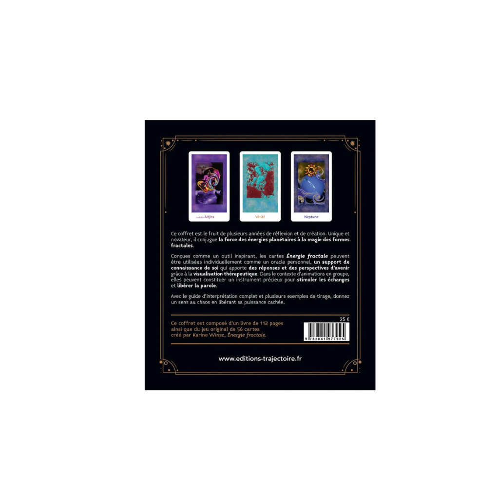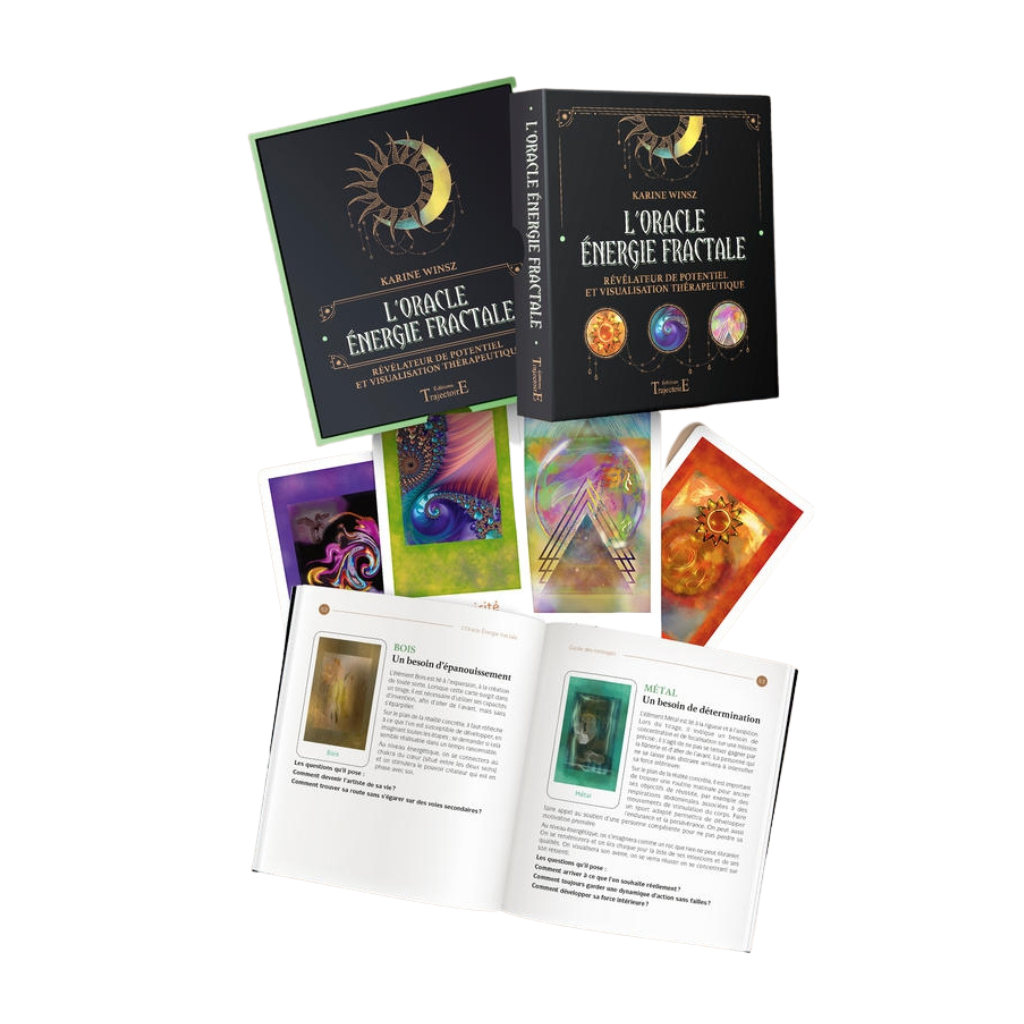 Ce coffret est le fruit de plusieurs années de réflexion et de création. Unique et novateur, il conjugue la force des énergies planétaires à la magie des formes fractales. Conçues comme un outil inspirant, les cartes Énergie fractale peuvent être utilisées individuellement comme un oracle personnel, un support de connaissance de soi qui apporte des réponses et des perspectives d’avenir grâce à la visualisation thérapeutique. Dans le contexte d’animations en groupe, elles peuvent constituer un instrument précieux pour stimuler les échanges et libérer la parole. Avec le guide d’interprétation complet et plusieurs exemples de tirage, donnez un sens au chaos en libérant sa puissance cachée. Ce coffret est composé d’un livre de 112 pages ainsi que du jeu original de 56 cartes créé par Karine Winsz, Énergie fractale.