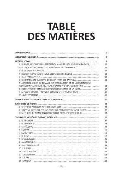 Dans ce coffret, destiné aussi bien aux novices qu’aux initiés, l’auteure, Erna Droesbeke, reprend les interprétations de Mlle Lenormand avec une méthode simple et accessible. À l’aide des 36 cartes, du tapis de tirage et du livre, vous pourrez démêler votre destin et déchiffrer les événements à venir dans plusieurs domaines : relations, carrière, santé, prospérité, famille, amitié, amour…