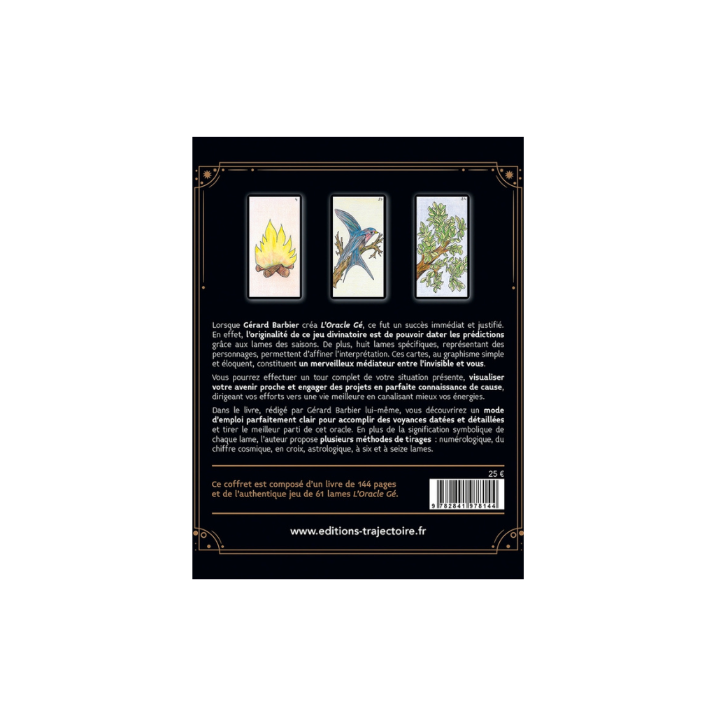 Lorsque Gérard Barbier créa L’Oracle Gé, ce fut un succès immédiat et justifié. En effet, l’originalité de ce jeu divinatoire est de pouvoir dater les prédictions grâce aux lames des saisons. De plus, huit lames spécifiques, représentant des personnages, permettent d’affiner l’interprétation. Ces cartes, au graphisme simple et éloquent, constituent un merveilleux médiateur entre l’invisible et vous. Vous pourrez effectuer un tour complet de votre situation présente, visualiser votre avenir proche et engager des projets en parfaite connaissance de cause, dirigeant vos efforts vers une vie meilleure en canalisant mieux vos énergies. Dans le livre, rédigé par Gérard Barbier lui-même, vous découvrirez un mode d’emploi parfaitement clair pour accomplir des voyances datées et détaillées et tirer le meilleur parti de cet oracle. En plus de la signification symbolique de chaque lame, l’auteur propose plusieurs méthodes de tirages : numérologique, du chiffre cosmique, en croix, astrologique, à six et à seize lames.