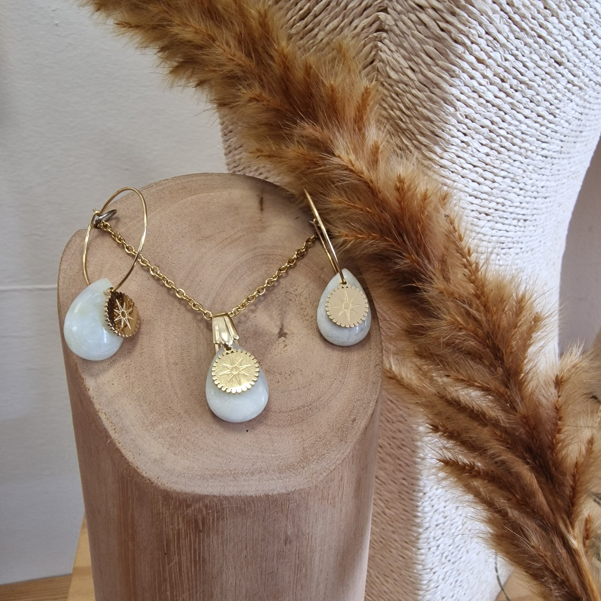 Collier avec pendentif en jade et chaine en acier or, boucle d'oreille pendante style créole avec pierre de jade et breloque motif étoile.