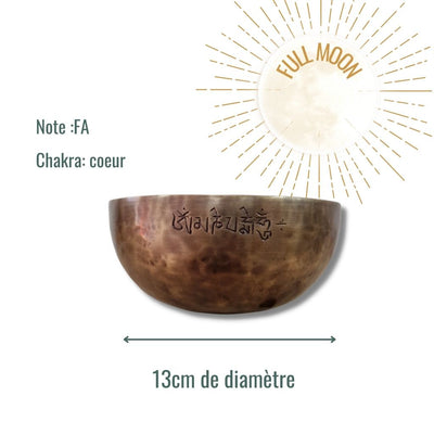 Les bols Full Moon sont les bols en métal de la plus haute qualité reconnue a ce jour, c'est un bol en métal martelé à la mains les soir de pleine lune. Il est donc très rare et doté d'une énergie particulière. Leurs sons en est plus profond et la texture de la note est plus pure et raisonne plus longtemps qu'un bol tibétain classique. Par l'union des énergies de la terre et de la lune ce bol procure une sensation de communion, de bien-être par ce chant de pure qui en fait un moment de connexion avec l'univers, un moment d'extase émotionnel inexplicable.